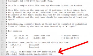 Remember the resulted IP addresses from our WHOIS query and from pinging the blocked address? Well, now it’s time to add them both in the “hosts” file using the following format: